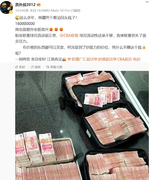 赵睿加盟北京首钢一事,新疆男篮是大赚特赚了!新疆篮球博主、铁杆球迷“员外叔2012”在社交媒体上发文表示,赵睿卖了1.6亿,我疆终于看见回头钱了!也是替孙老板高兴!